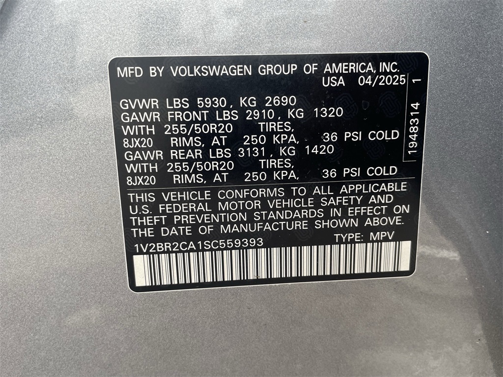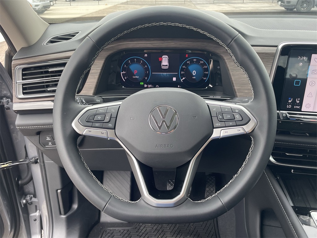 l, Brake assist, Bumpers: body-color, Compass, Delay-off headlights, Driver door bin, Driver vanity mirror, Dual front impact airbags, Dual front side impact airbags, Electronic Stability Control, Emergency communication system: VW Car-Net Safe & Secure 5-year, Exterior Parking Camera Rear, Four wheel independent suspension, four-wheel independent suspension, Front anti-roll bar, Front Bucket Seats, Front Center Armrest, Front dual zone A/C, Front fog lights, Front reading lights, Fully automatic headlights, Heads-Up Display, heated and Actively ventilated front bucket seats, Heated door mirrors, Heated front seats, Heated rear seats, Heated steering wheel, Illuminated entry, Low tire pressure warning, Memory seat, MIB3 discover media with navigation, Navigation System, Occupant sensing airbag, Outside temperature display, Overhead airbag, Overhead console, Panic alarm, Passenger door bin, Passenger vanity mirror, perforated vienna leather seating surfaces, Power door mirrors, Power driver seat, Power Liftgate, Power moonroof: Panoramic, Power passenger seat, Power steering, Power windows, Radio data system, Rain sensing wipers, Rear air conditioning, Rear anti-roll bar, Rear reading lights, Rear seat center armrest, Rear window defroster, Rear window wiper, Remote keyless entry, Security system, Speed control, Speed-sensing steering, Split folding rear seat, Spoiler, Steering wheel mounted audio controls, Tachometer, Telescoping steering wheel, Tilt steering wheel, Traction control, Trip computer, Turn signal indicator mirrors, Variably intermittent wipers, and Ventilated front seats. 2025 Volkswagen Atlas 2.0T SEL 4D Sport Utility Silver Price includes: $3500 - Retail Customer Bonus. Exp. 01/05/2026